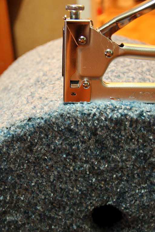 - Всю зону лежака обклеивают тканью поверх поролона. Лучше дополнительно закрепить её мебельным степлером.