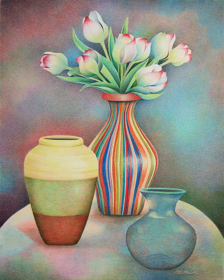 Повторяющиеся формы. Рисование лагера, маленьких вазочек или дополнительных предметов — хороший способ добавить визуального контраста. Эти элементы можно нарисовать точно так же, как и вазу.![]()