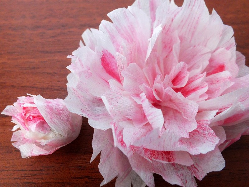 Из бумаги большой длины вырезается полоса шириной 10 см. Край заготовки делают неровным, защипывая пальцами по всей длине. После этой операции полосу складывают в бутон, он крепится к проволоке нитью. Создать удивительную композицию можно всего за 1 час.