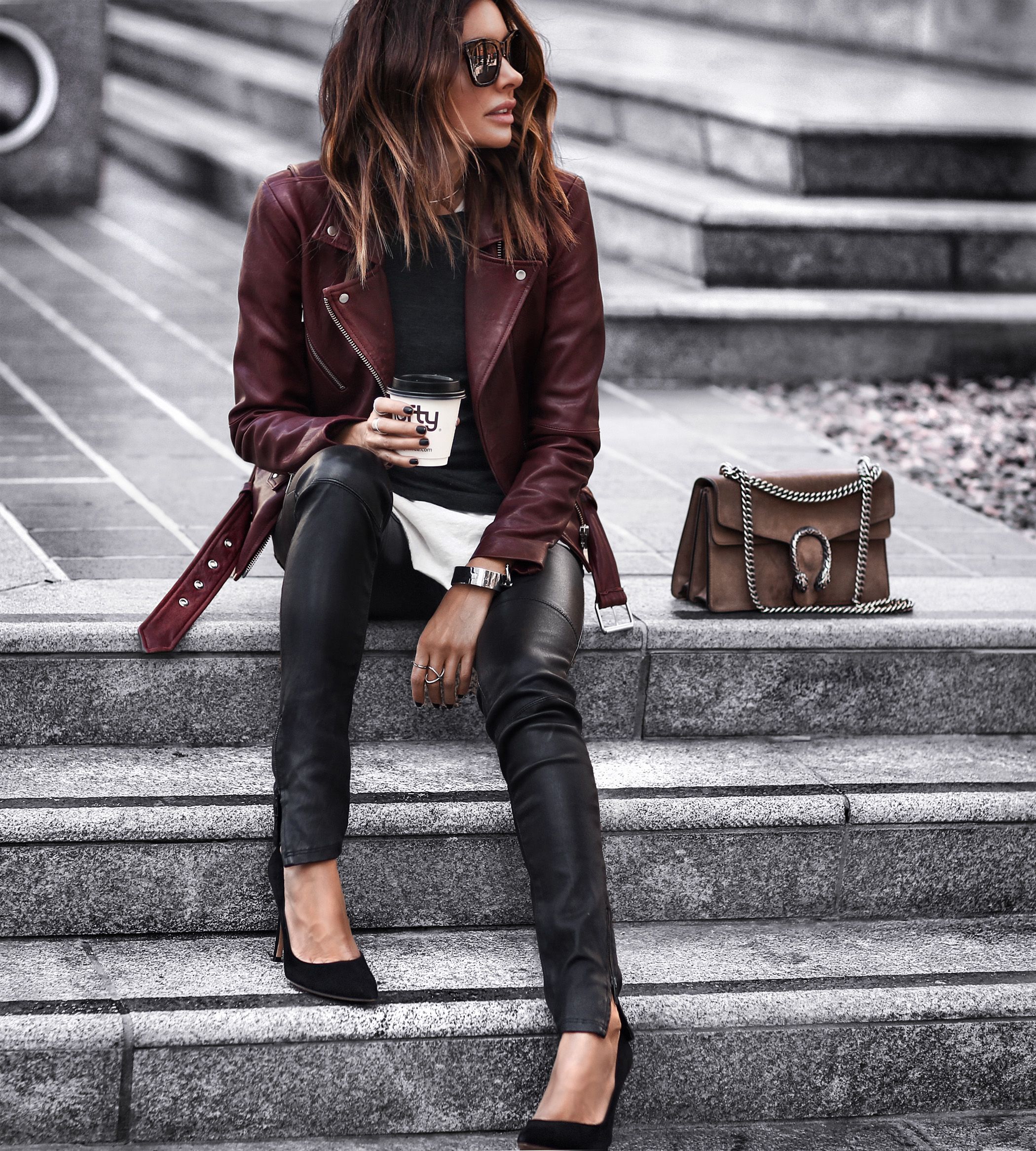 Узкие брюки, в том числе и кожаные, сегодня достаточно популярны, их можно компоновать с яркими блузами, свободными рубашками, свитшотами и ботинками на платформе или толстом каблуке.