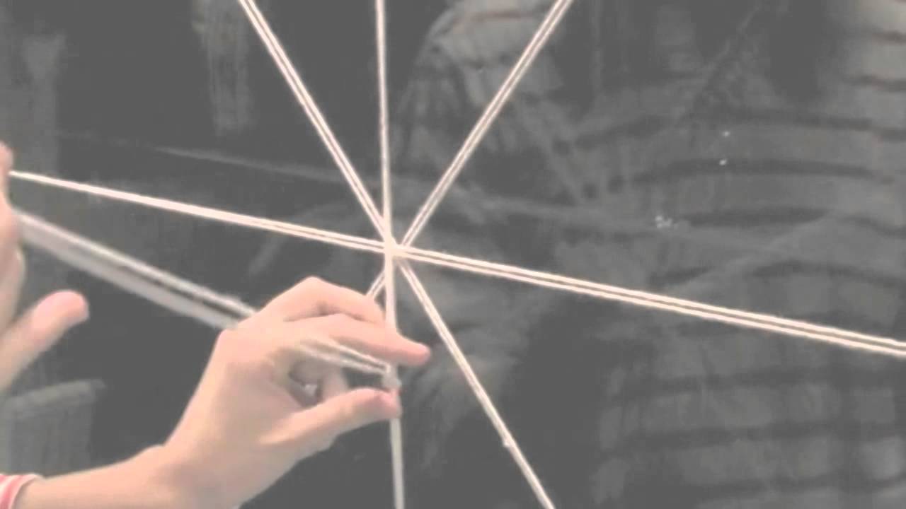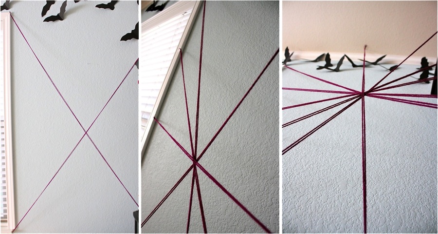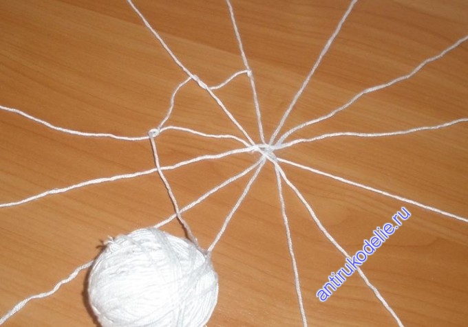 - Затем возьмите длинный отрезок пряжи и начните постепенно формировать паутину. Привяжите один конец пряжи к одному из длинных отрезков нити и проделывайте то же самое с каждым из длинных отрезков.