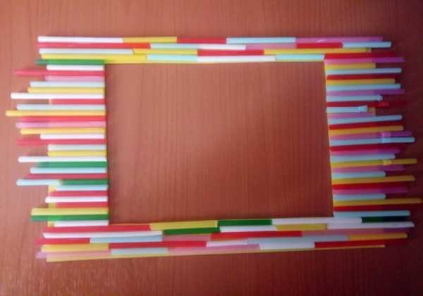 Берем цветную заготовку рамки и создаем композицию из деталей трубочек для коктейля. Детали могут быть как длинными, так и короткими.