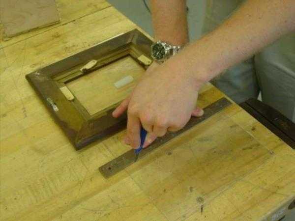 Отмерьте длину внутренней стороны рамки, сделайте отметку и отрежьте под углом 45 градусов.