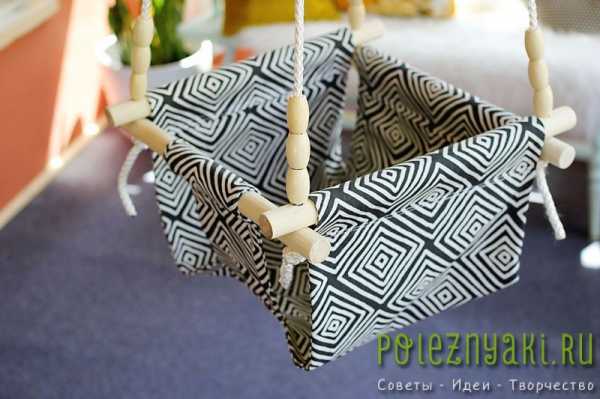 В результате должны получиться веселые и безопасные качели для малыша, который уже может сидеть самостоятельно. В таких подвесных качелях будет комфортно чувствовать себя ребенок двух-трех летнего возраста. При желании эти качели можно сделать максимально универсальными и использовать, дома, на веранде или на даче, прикрепив их к ветке дерева.