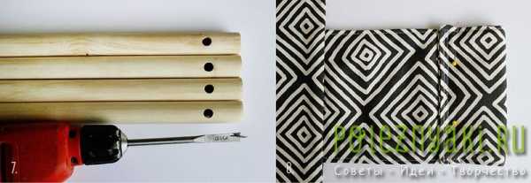 Шаг седьмой: Распилите каждый деревянный стержень на две равные части. На расстоянии 2-3 см от края каждого стержня просверлите отверстие. Зашкурьте и отшлифуйте деревянные детали.