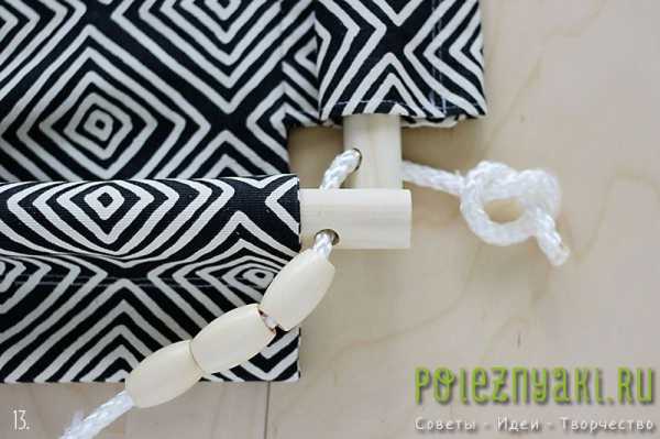 Шаг тринадцатый: Приступаем к сборке качелей. Два деревянных стержня (боковые) должны располагаться над двумя другими. Если вы хотите украсить веревки, то сначала наденьте на край бусины, а затем протяните конец веревки сначала в отверстие на боковой перекладине, а потом на передней или задней. На конце веревки завяжите свободный узел. Повторите эти же действия для остальных углов. Бусины можно нанизывать только на те веревки, которые будут проходить по передней части качелей. Отрегулируйте длину веревок, закрепите узлы и обрежьте лишние концы веревки.