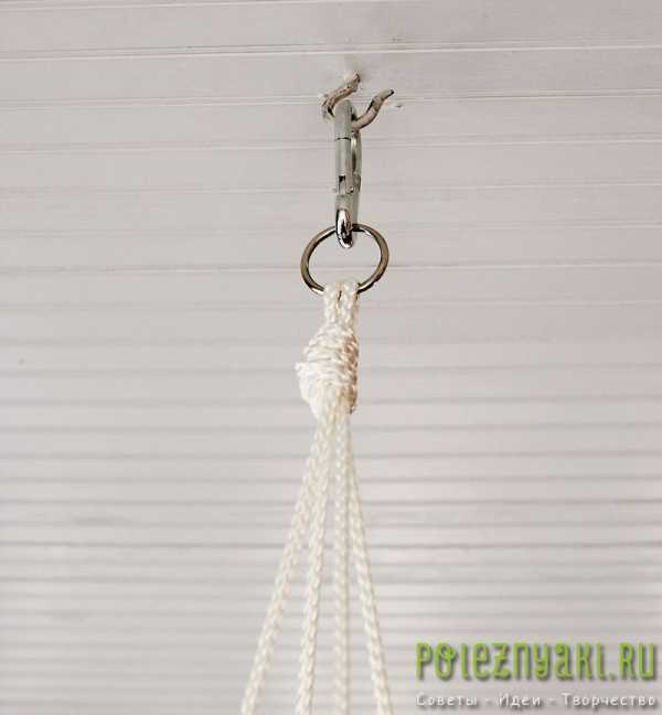 Шаг двенадцатый: Протяните обе веревки через стальное кольцо, и найдите середину веревок. Свяжите узел. Пристегните стальное кольцо к карабину.