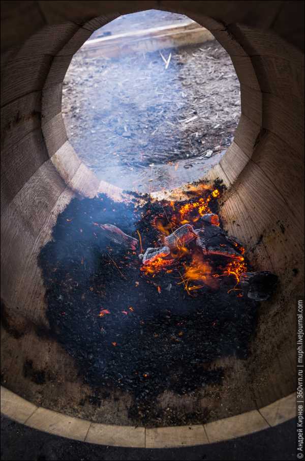 Для того, чтобы максимально плотно прижать клёпки друг к другу, внутри пока еще бездонной бочки разводят самый настоящий костёр.