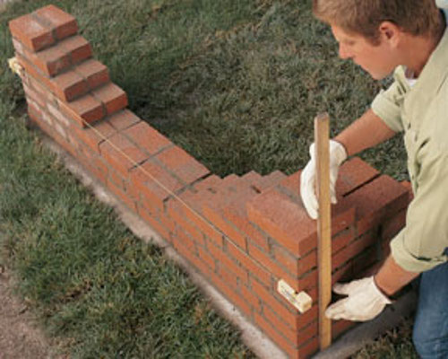 Если вы когда-нибудь наблюдали за работой профессионального каменщика, то обязательно должны были заметить, что в первую очередь он всегда выводит углы, и они намного выше от средних частей стен. Это делается с целью получения маяков-реперов, через которые натягивают шнур-причалку для обозначения линии кладки и ее высоты. Чтобы избежать провисания шнура, его натягивают довольно туго и время от времени перекладывают кирпичами-маяками для поддержки.