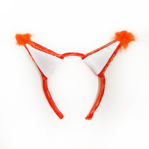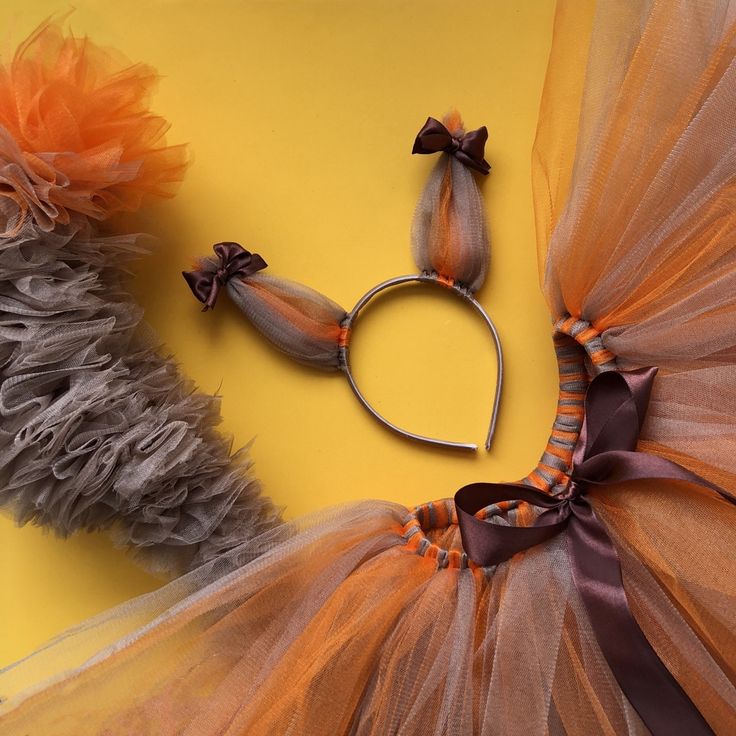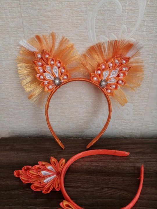 - Для того чтобы сделать ушки нам понадобятся поролоновые плечики, атласная ленточка оранжевого цвета, остатки оранжевой органзы, ножницы, клей и пластмассовый ободок для волос.