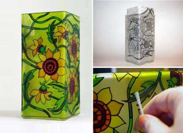 Понадобится: стеклянная лампа, витражные или акриловые краски, канцелярский нож, маркер на спиртовой основе, калька, контур по стеклу, ватные палочки (для удаления погрешностей при работе), жидкость для снятия лака.