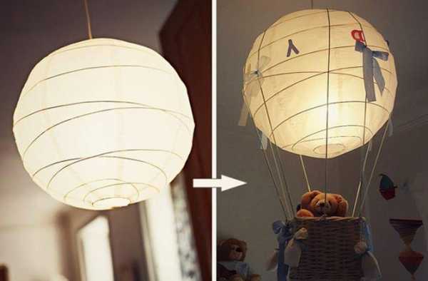 Круглый плафон в детской комнате можно превратить в воздушный шар. Задекорируйте конструкцию веревкой и подвяжите снизу корзинку. Обязательно убедитесь в том, что люстра прочно закреплена на потолке и сможет выдержать дополнительный груз. В любом случае используйте маленькую легкую корзинку и небольшого плюшевого медведя.