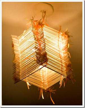 - По периметру квадрата выкладываются палочки и соединяются клеем. Занятие довольно кропотливое, но вас ждет превосходный результат. Высота плафона будет зависеть от вашего желания, высоты потолка в помещении или от количества материала.