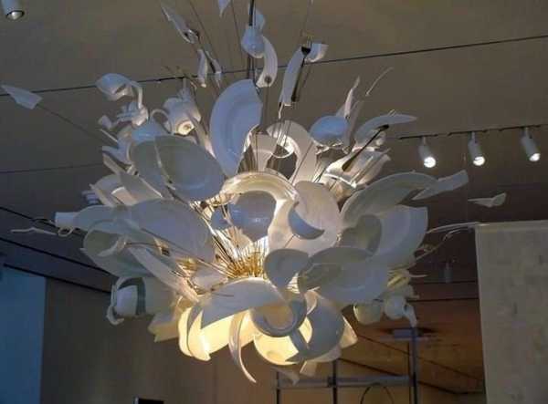 Умельцы чего только не придумают, чтобы создать что-то интересное. Например, используют одноразовую пластиковую посуду — бросовый копеечный материал — для создания предметов интерьера, в том числе и бра, своими руками. Пластиковые ложки, отрезав у них черенки, собирают в форме цветка, склеивая их между собой по окружностям и по рядам. Одноразовые вилки, также без черенков, собирают, как конструктор, при помощи зубчиков в сферу для плафона. Тарелки сгибают, получая два полукруга, и тоже скрепляют между собой. Это интересное решение бра своими руками, которое активно используется в декоративном искусстве.