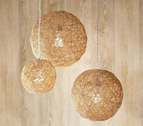 Красивый светильник можно сделать из старого светильника и бамбуковых палок, перевязанных веревкой кокосового волокна. Устройство элементарное, три бамбуковые палки связываются между собой. Две вертикально, а одна между ними горизонтально и крепится к стене. Абажур от старого светильника веревкой присоединяется к горизонтальной бамбуковой палке. Такую конструкцию можно разместить в доме, на крыльце или беседке.