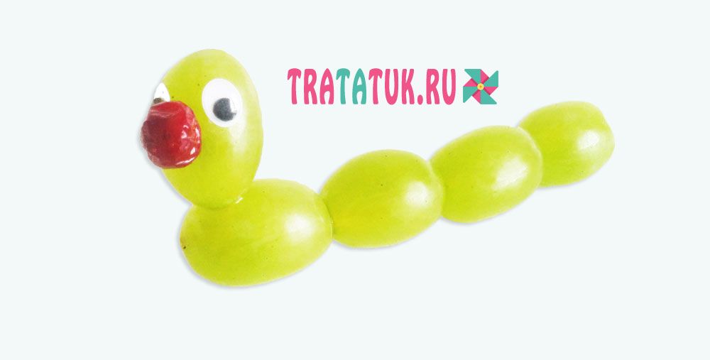 Еще одна простая поделка. Как сделать гусеницу из винограда? Попросту скрепить вместе плотные виноградины с помощью зубочистки, а затем добавить глаза и нос-ягодку.