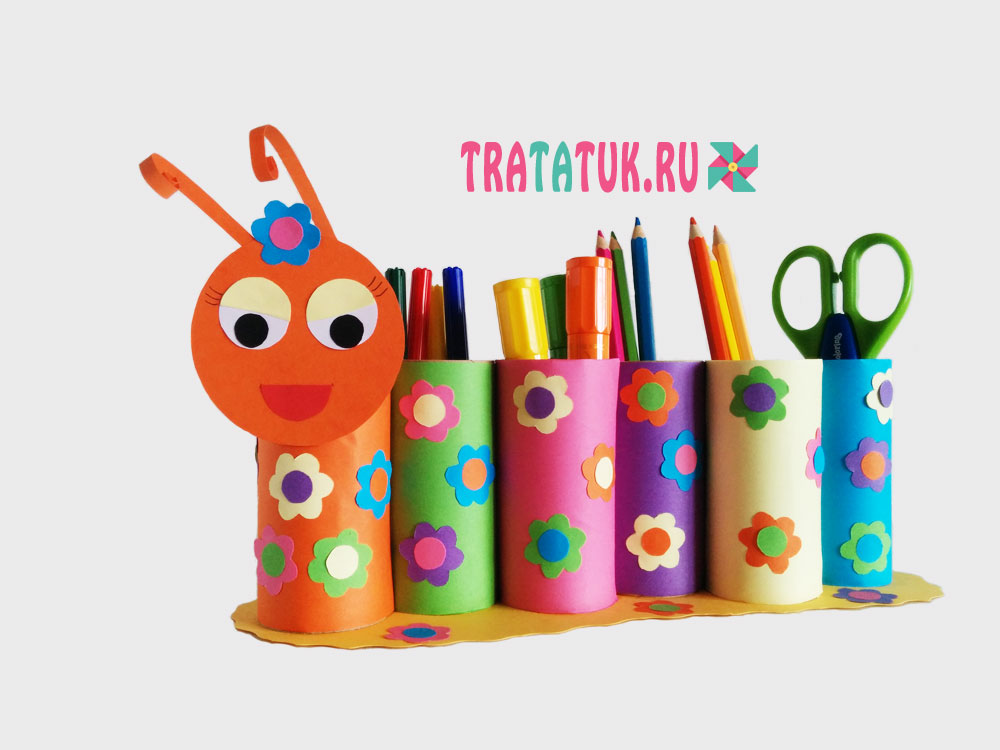 Поделка также из втулок, но она может выполнять не только игровую функцию, но и очень полезную. Длинная гусеница из нескольких втулок может собрать в одном месте карандаши, фломастеры и прочую канцелярию, при этом выглядеть красиво и оригинально. Работа также максимально простая, втулки нужно обклеить цветной бумагой или раскрасить, а затем склеить все впритык на картонке.