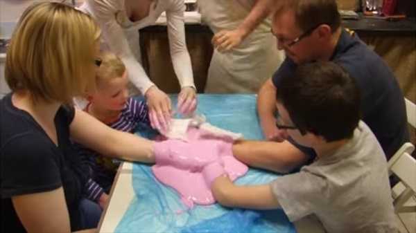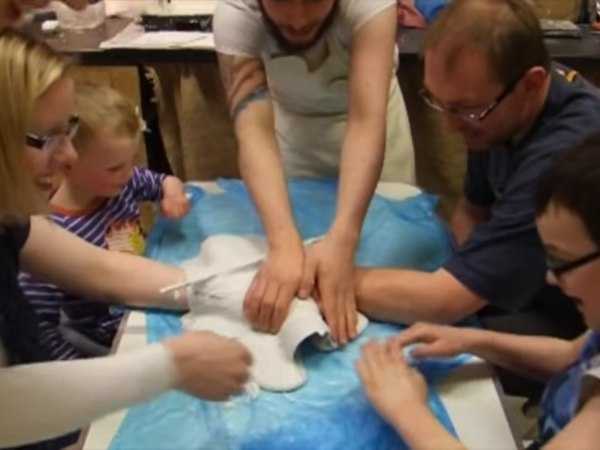 Если это будут руки или другие части тела — они должны оставаться без движения до полного застывания гипсового материала. - После застывания гипсовых бинтов аккуратно высвободи форму. Если это руки — вынимай каждую по отдельности, чтобы не нарушить форму оттиска.