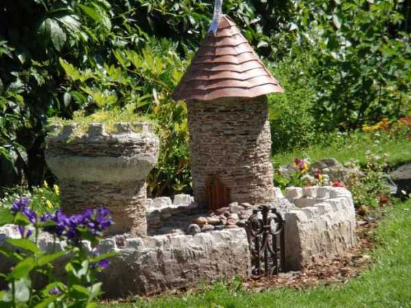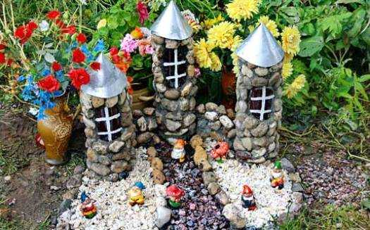 - Замок из камней – придание саду торжественности и значимости. Для его изготовления нужно отыскать трубы (сколько башен предполагается, столько материала и нужно), камни, битая плитка, цемент и литров на 1,5 бутылки из-под пива.