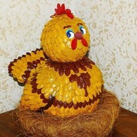 Туловище и голова состоят из двух частей — передней и задней. Две передние части скручиваем сначала из желтого картона, а сверху несколько рядов коричневого. Обе спинки полностью из коричневого картона. Детали нужно немного выдавить и приклеить обратно горячим клеем.