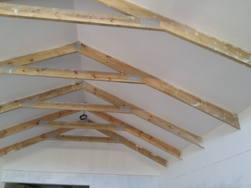 Стропила имеют разрез под углом, чтобы встретиться с коньковой доской, и выемку в виде «птичьего рта» в местах пересечения с опорными стенками. Хомут-стяжка часто соединяется с короткой частью на верхней пластине, а затем проходит горизонтально к длинной наклонной части.