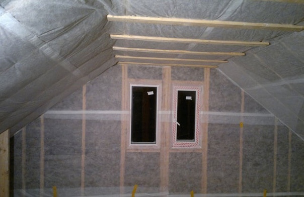 Этот материал состоит из гладкой стороны, которая размещается к утеплителю, и более шершавой, которая направлена к самому зданию и выполняет забор паровых выделений из помещения. Укладка такой пленки является важным моментом для полноценной ее работы. Процесс монтажа происходит при помощи степлера. В этом случае можно обойтись без контробрешетки, но все стыки важно проклеить при помощи скотча.