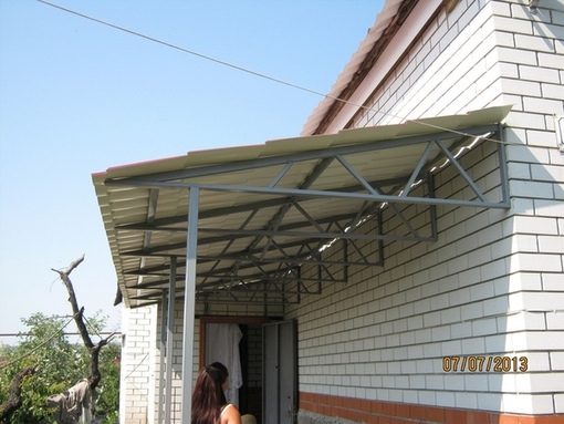 7. Теперь следует сделать крышу навеса. При сборке каркаса крыши руководствуйтесь подготовленным ранее чертежом. Чтобы сделать легкий козырек для покрытия используется поликарбонат, который крепится на легкий и гибкий перфорированный профиль из алюминия, это к тому же позволяет придать кровле арочную форму. Для более тяжелых кровельных материалов применяются металлические или деревянные обрешетки.