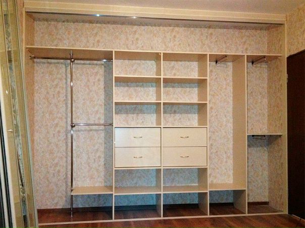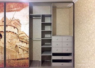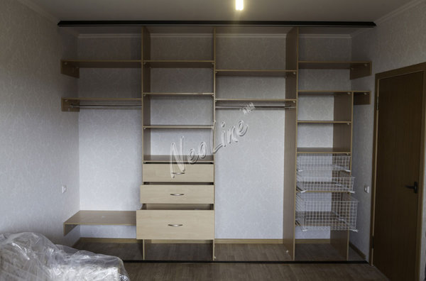 Внутреннее наполнение шкафа определяется самостоятельно. Количество отсеков, выдвижных ящиков, наличие или отсутствие штанг и/или выдвижных вешалок для одежды выбирается в соответствии с индивидуальными требованиями.