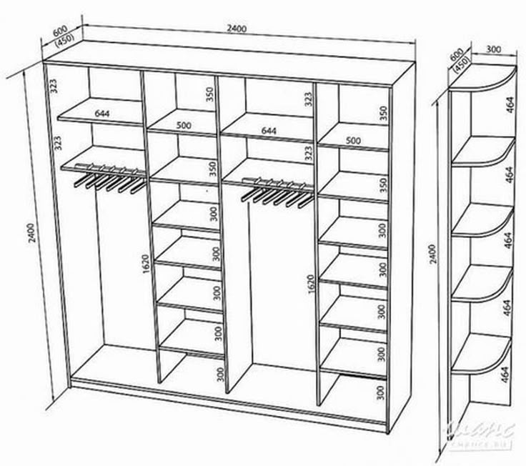 Среди готовых проектов можно найти модели разных габаритов, но средние значения обычно таковы: высота – 2400 мл, глубина 40-45 см, ширина – 1600 мл. Чтобы правильно рассчитать размеры, необходимо определиться с назначением шкафа: какие именно вещи будут в нем храниться? Отталкиваясь от этого, нужно провести расчеты.