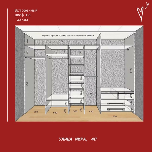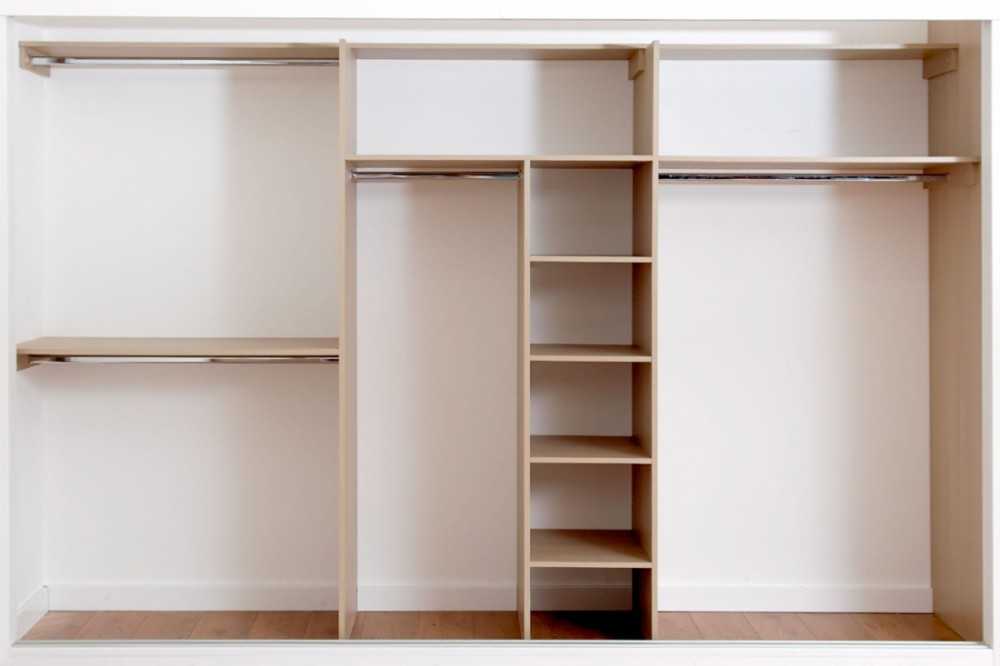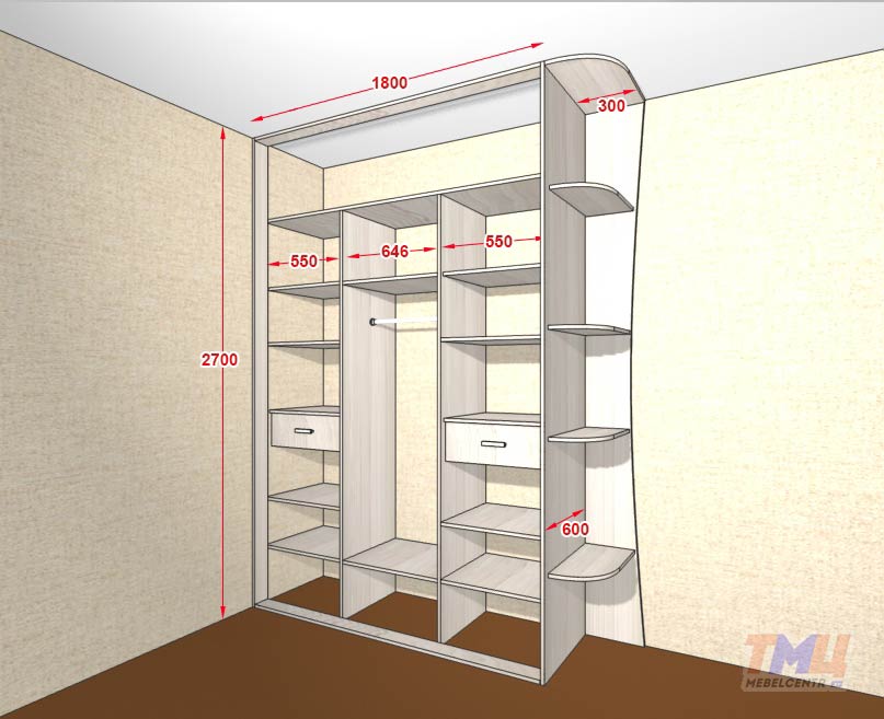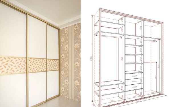 Параллельно с этим производятся замеры помещения, в которое будет устанавливаться сам шкаф и осуществляются все необходимые расчеты. Размеры встроенного шкафа необходимо рассчитать по размерам ниши, после производятся расчеты внутренних отсеков.