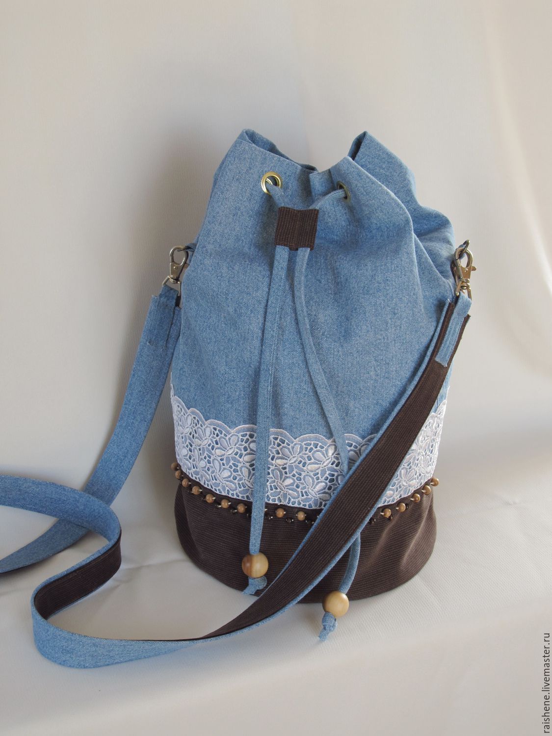 Такой аксессуар очень прост в пошиве, так как для изготовления даже не нужно выполнять выкройку джинсов. Отдаленно он похож на мешок, зато довольно вместительный и при этом не занимает много места.