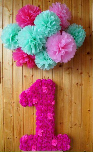 Такая цифра станет отличным задником для праздничной фотосессии. После дня рождения она может просто висеть на стене в качестве украшения, пока именинник не повзрослеет еще на год. Цветы можно сделать любым способом (из бумаги, из ткани) или использовать готовые.