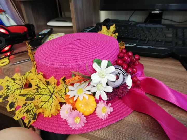 Оригинальную осеннюю шляпу можно сделать из кленовых листьев. Для нее потребуются только листья в большом количестве (около 250), ножницы и шило или спица. Листики могут быть разных размеров и цветов, главное, чтобы они были мягкие и обязательно должны быть длинные черенки.