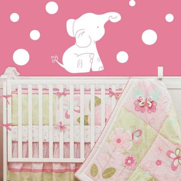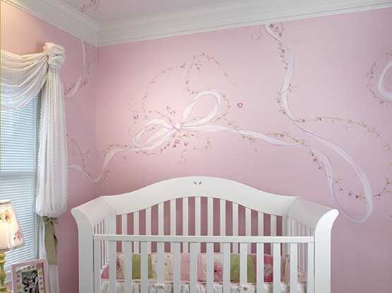 На фото детская для новорожденного и стены розового цвета с рисунками.