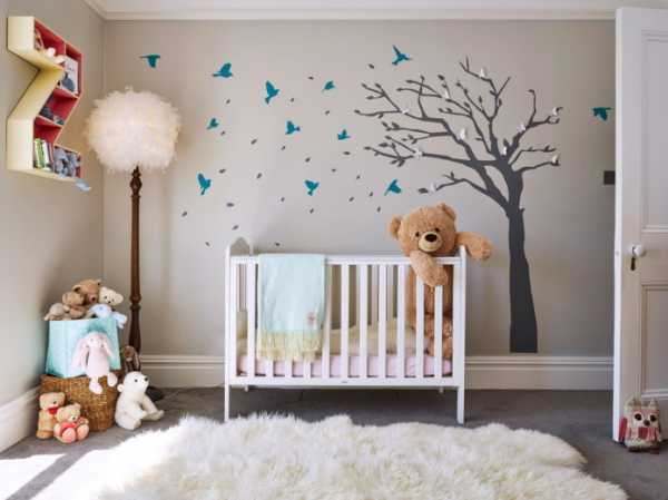 На фото наклейка в виде дерева на стене в детской комнате для новорожденного.