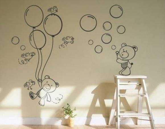 Очень хорошо для придания стенам большей декоративности использовать специальные стикеры — виниловые наклейки, которые могут изображать любых мультипликационных персонажей, героев сказок — что угодно. Такое декорирование поможет украсить детскую комнату, порадует и мальчика, и девочку.