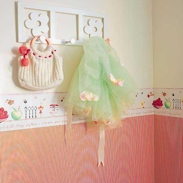 Ну и, конечно же, любую стену можно использовать не только с декоративной, но еще и практической стороны. Стены в детской украсят всевозможные полочки и крючочки с девичьими мелочами.