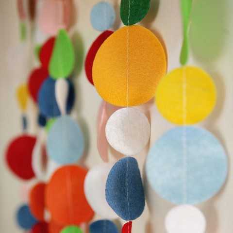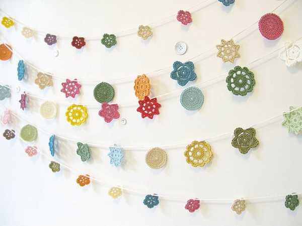 Также заслуживают особого внимания настенные гирлянды, выполненные своими руками из двусторонней цветной бумаги, ткани или блестящей упаковочной бумаги разных цветов и оттенков. Из бумаги вырезаются разнообразные геометрические фигурки, всевозможные сердечки, цветочки, далее они аккуратно нанизываются иголкой на нитку на одинаковых расстояниях друг от друга. Готовые ряды в последствие фиксируются посредством деревянной балки или веревок на стену.