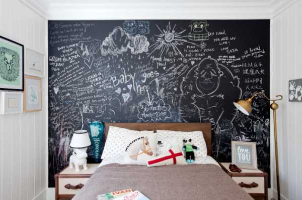 Графитовая стена прекрасно подходит для рисования мелом. Данный декор предоставляет ребенку свободу для творчества и позволяет наносить различные рисунки, стирать их и рисовать новые, тем самым каждый раз создавая в помещении уникальный интерьер.