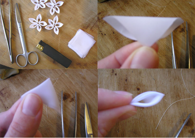 Мастер класс по складыванию лепестков. Используя карандаш и линейку, нужно разметить квадраты размером 5 см2 и при помощи ножниц или паяльника нарезать тряпочные ленты. Полученный квадрат складывается по диагонали в треугольник. Его, в свою очередь, следует сложить два раза по пополам. Места сгиба следует тщательно выровнять. Затем края ткани необходимо ровно обрезать и быстро обжечь над свечкой скрепляя края. В результате получается лепесток. Последовательный процесс складывания представлен на нижеследующем фото.
