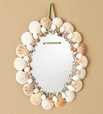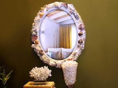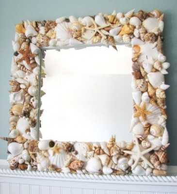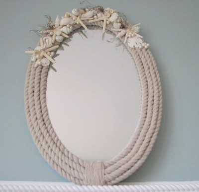 В интерьере зеркала украшенные ракушками смотрятся необыкновенно красиво. Их можно повесить в прихожей, и в спальне, и в гостиной, ну и конечно-же в ванной. В декоре зеркал, кроме различных ракушек используются и другие дополнительные материалы для украшения, например: бусины, декоративная верёвка или канат, акриловые краски для окрашивания ракушек и т.д.
