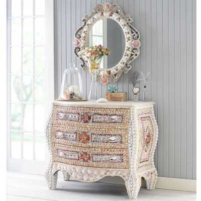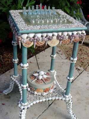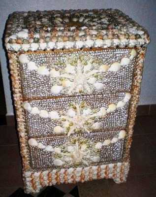 Столько труда вложено в эти замечательные, волшебные работы, которые поражают своей масштабностью, тщательной подборкой цветов и форм. Таких предметов интерьера вы точно ни у кого не найдете. Здесь и превосходные столики и компактные комоды, шахматный и чайный столик и полочки, задекорированные красивыми ракушками.