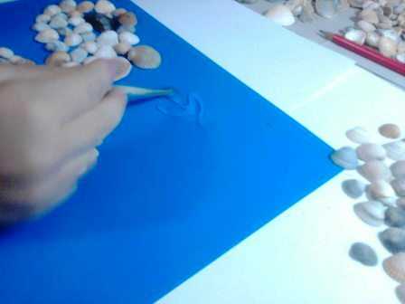 Минут через десять переверните картонку рисунком вниз, так вы проверите, все ли ракушки приклеились. Если какая либо ракушка упадет, смажьте ее клеем и приложите обратно.