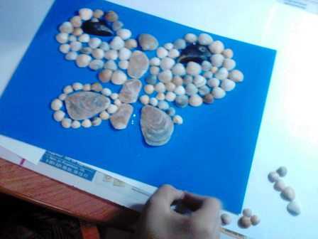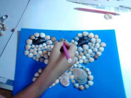 На листе картона первоначально делаем эскиз желаемого рисунка. В данном случае мы выложили из обтертых морем раковин туловище, из раковин от мидий сделали пятнышки на верхних крылышках, и обложили их мелким ракушечником. Нижние крылышки почти полностью состоят из раковины, обтесанной морем до овала, этот переливчатый овал мы обрамляем также мелким ракушечником.