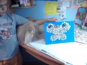 Картину из ракушек «Бабочка» мы сделали втроем: я, сын и кот Люсьен. Кот нам всегда во всем помогает, особенно ребенку, поэтому не сказать о том, что он принимал участие в нашей работе, было бы нечестно. Сыну шесть лет, в этом году мы первый раз ездили всей семьей на юг. Побывали сразу на двух морях – Азовском и Черном. На память о море мы привезли ракушки. Ракушки с Азовского моря мелкие и разноцветные. Черноморские ракушки крупнее, нескольких видов. Сокровища морей мы в шкаф прятать не захотели и решили сделать бабочку, тем более что в Тамани на Черном море бабочки с цветков запросто садились нам на нос.