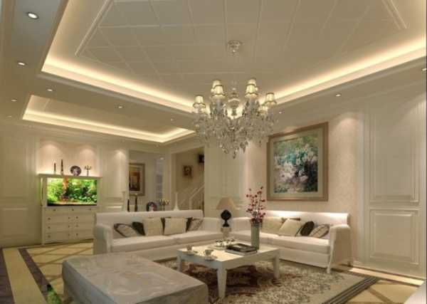 На этом фото – классические потолки для гостиной, собранные из гипсокартона. Наличие нескольких уровней позволило установить встроенные светильники и разделить помещение на несколько смысловых зон.