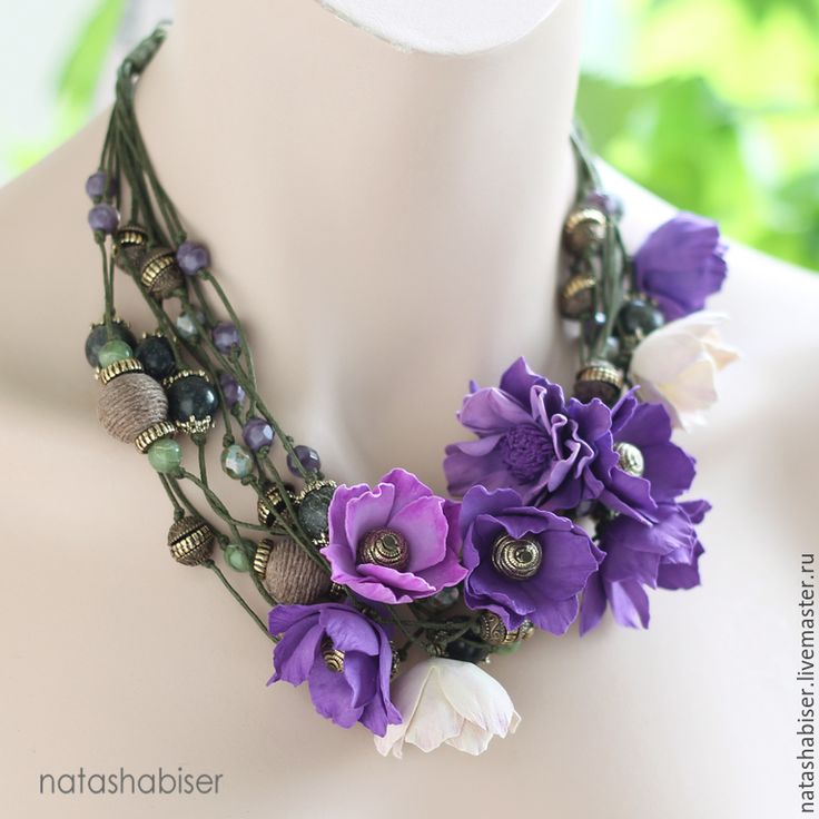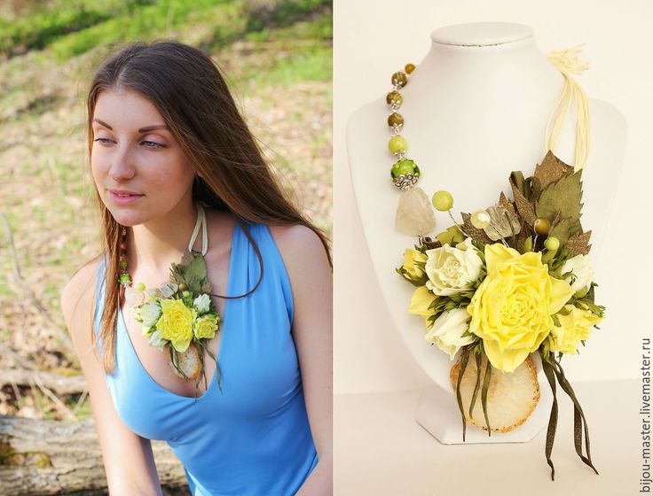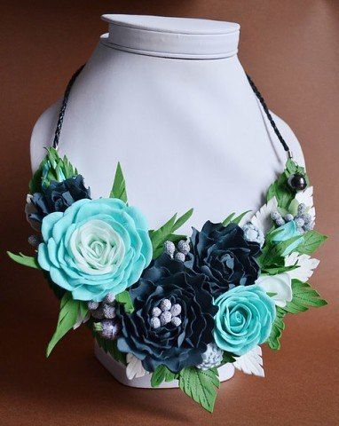 . Цветочное колье изготовлено из фоамирана или пластичной замши. Он декорирован атласной лентой и пластиковыми бусинами. Лента позволяет регулировать длину авторского украшения. Это дизайнерское цветочное колье будет великолепным дополнением к однотонной рубашке на пуговицах.