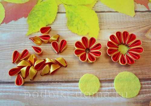 По описанной технике соберите остальные лепестки канзаши для колье. Следите, чтобы все они были одинаковыми.