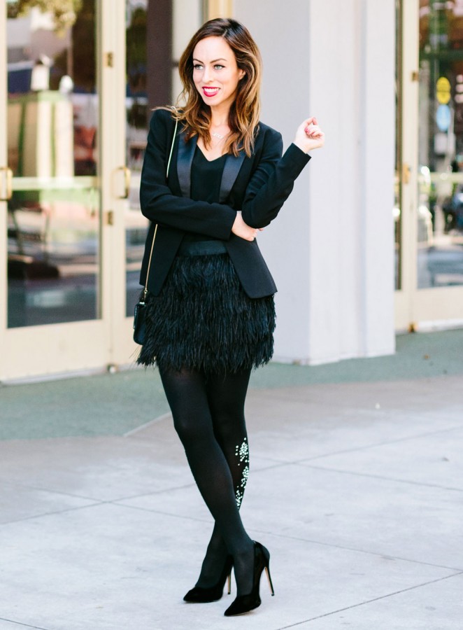 Уравновесят яркость низа в таком случае яркие аксессуары, блеск на платье или даже яркая помада в тон с колготками.