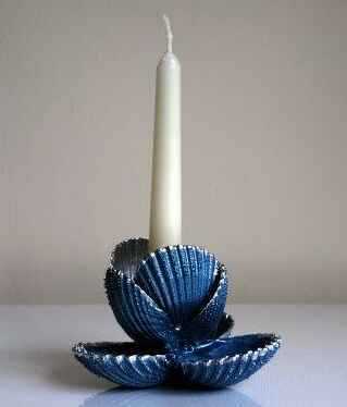 Простейший подсвечник показан на фото справа. Он состоит из нескольких предварительно раскрашенных ракушек, соединенных между собой клеем.